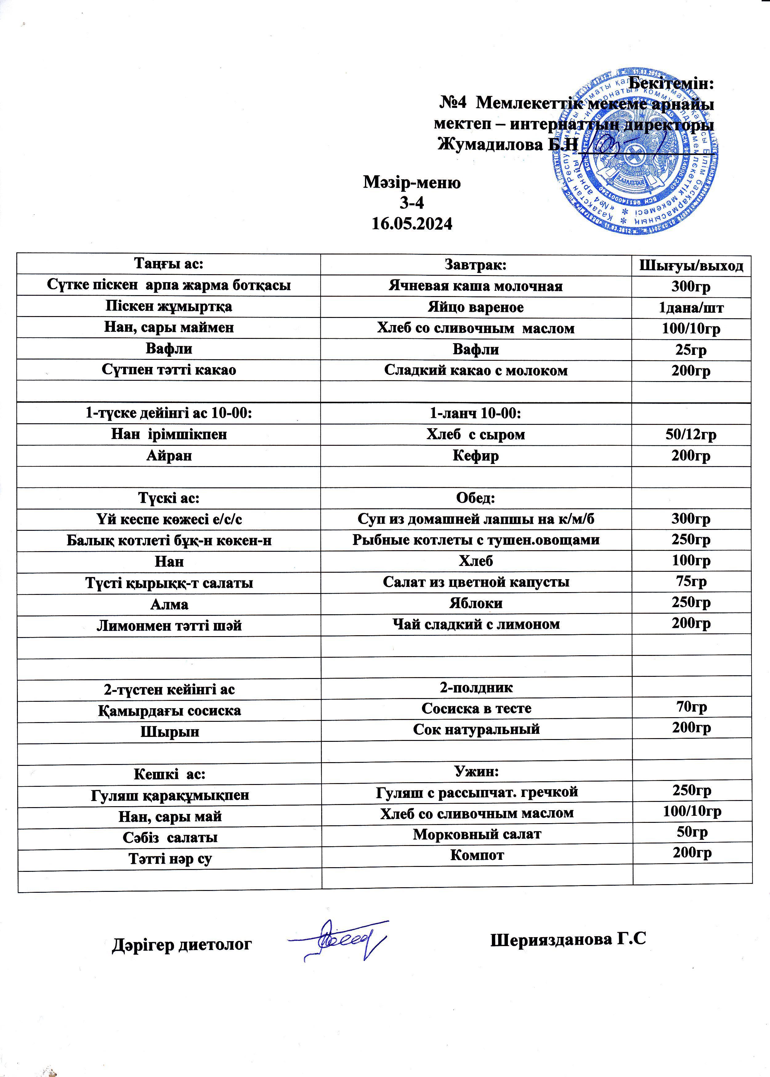 Күнделікті мәзір 16.05.2024 г/ Ежедневное меню на 16.05.2024г