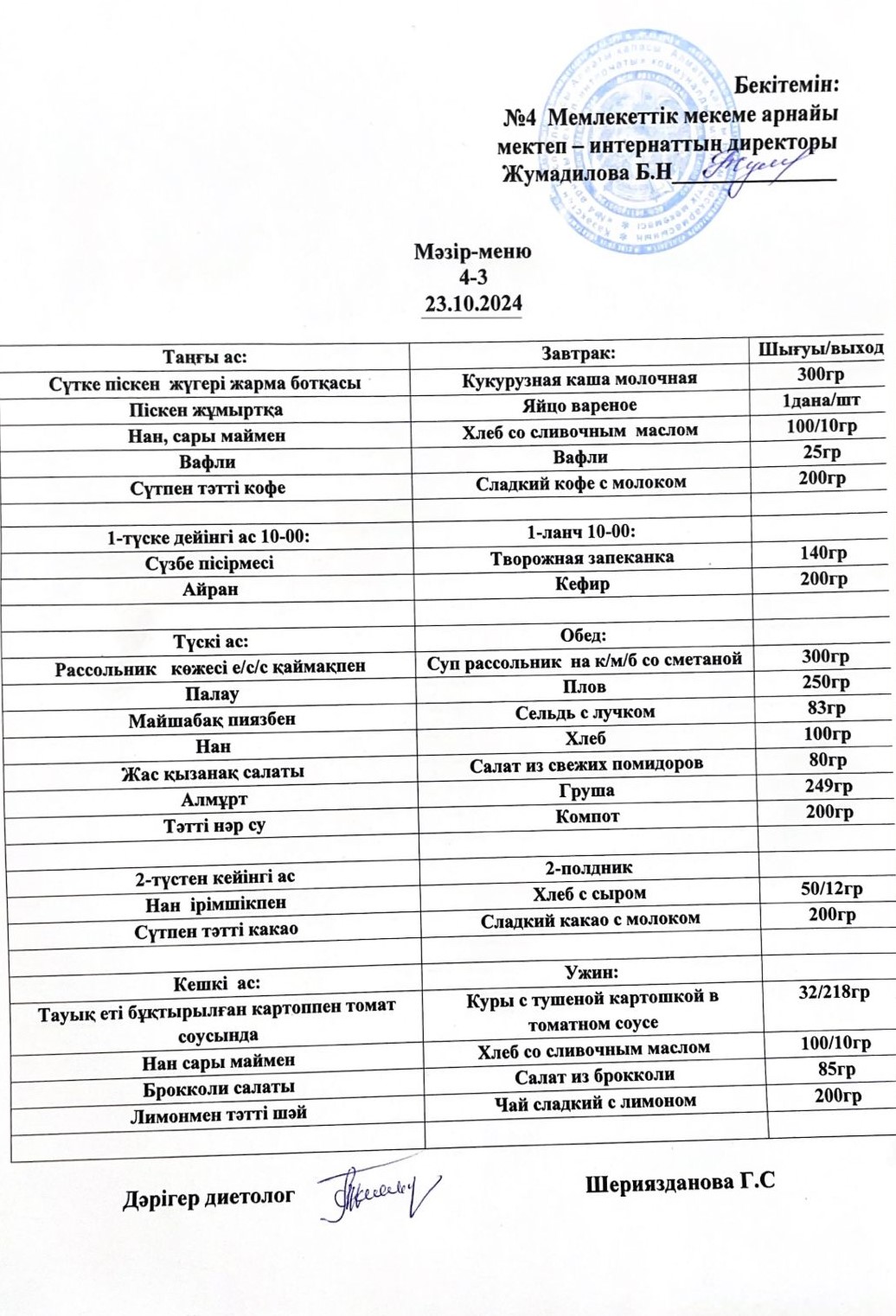 Күнделікті мәзір 23.10.2024 г/ Ежедневное меню на 23.10.2024г