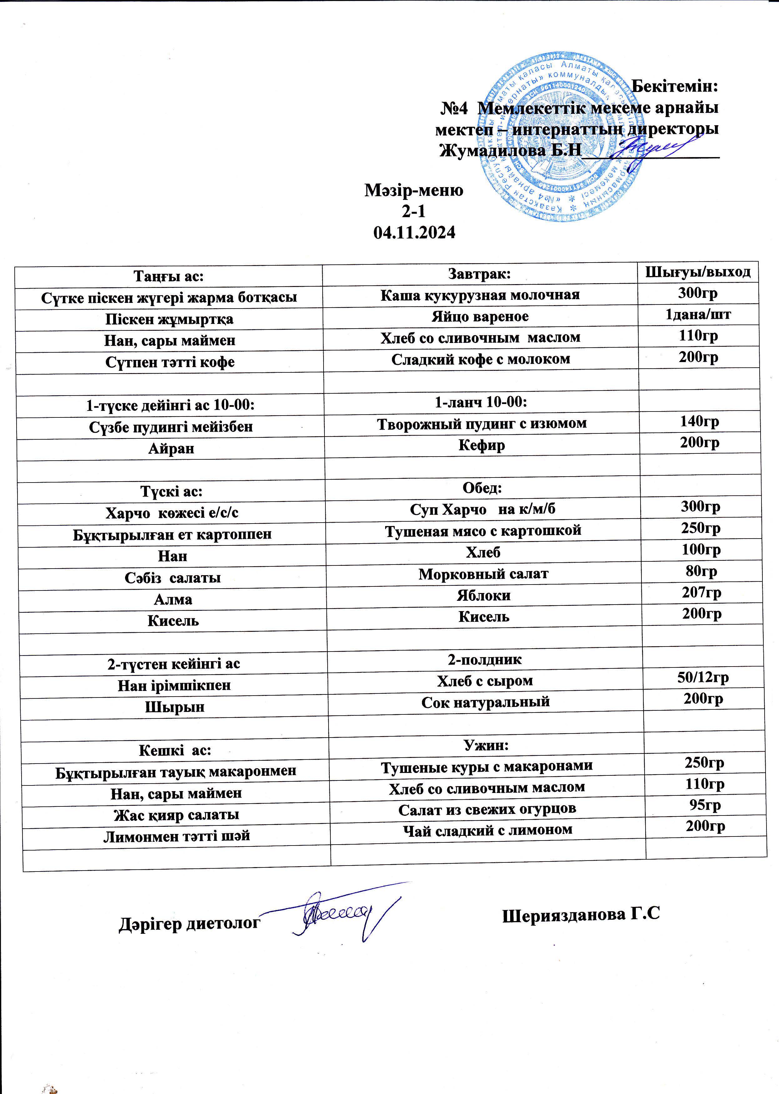 Күнделікті мәзір 04.11.2024 г/ Ежедневное меню на 04.11.2024г