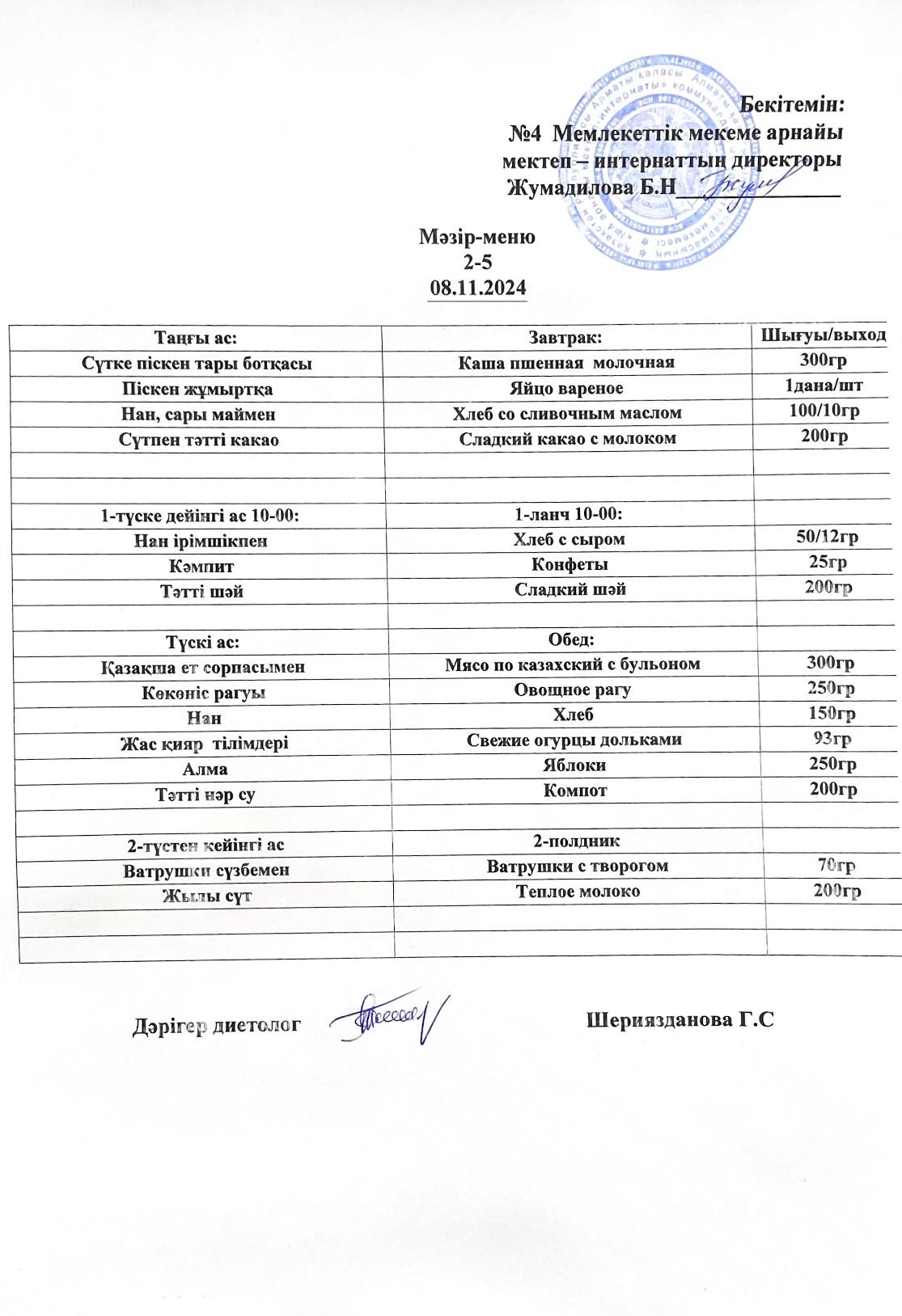 Күнделікті мәзір 08.11.2024 г/ Ежедневное меню на 08.11.2024г