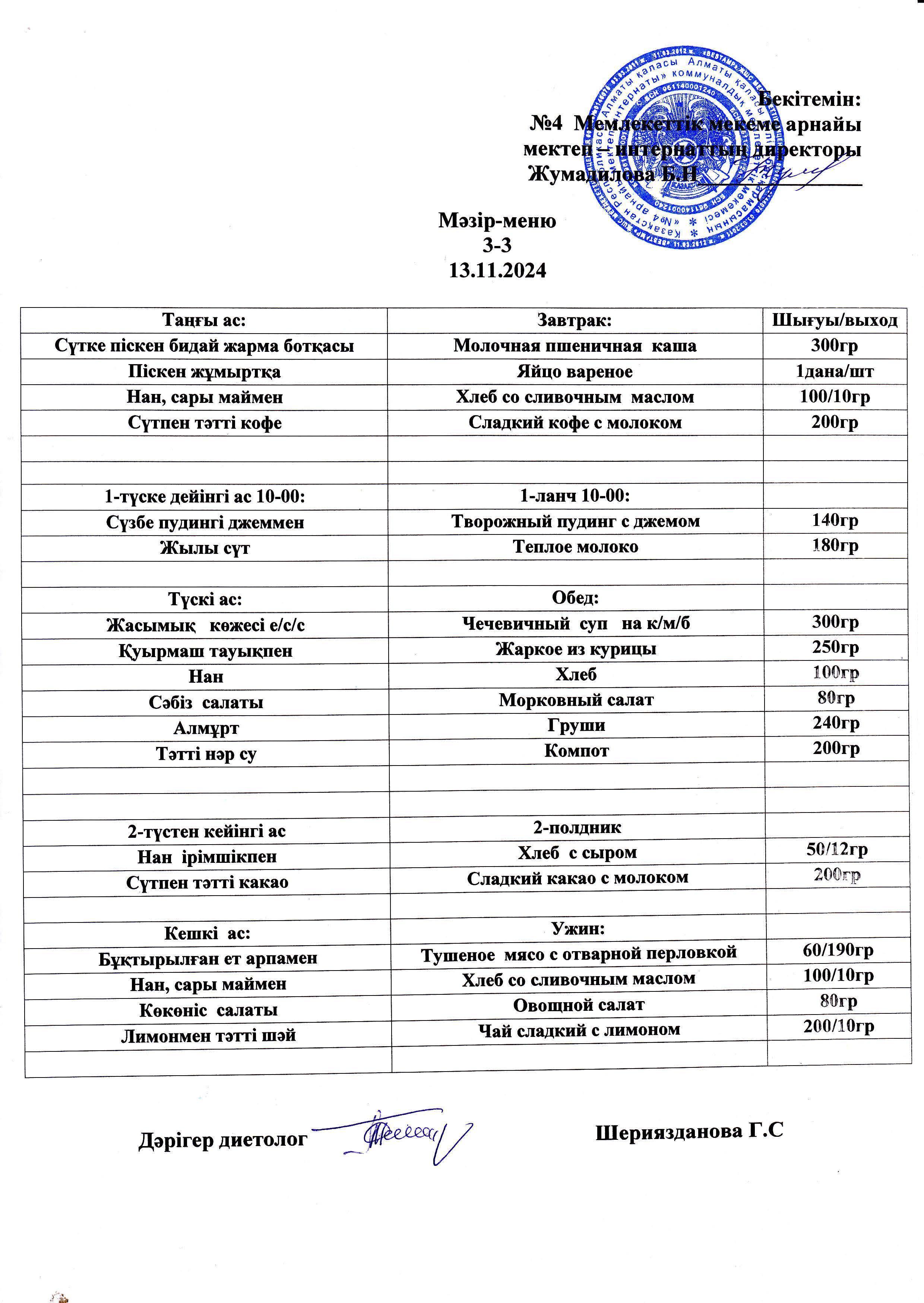 Күнделікті мәзір 13.11.2024 г/ Ежедневное меню на 13.11.2024г