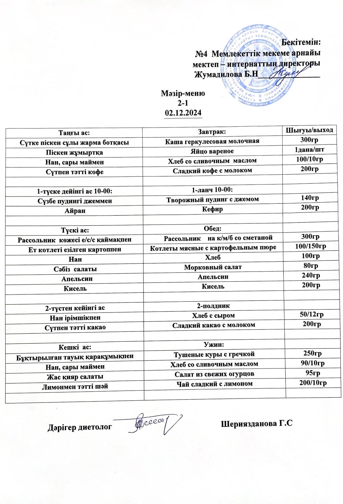 Күнделікті мәзір 02.12.2024 г/ Ежедневное меню на 02.12.2024г