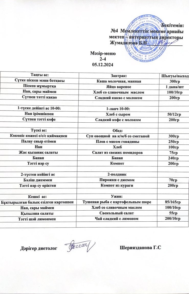 Күнделікті мәзір 05.12.2024 г/ Ежедневное меню на 05.12.2024г