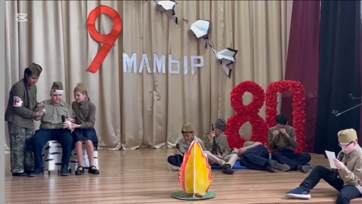 Сахнада оқушылар соғыс жылдарындағы өлеңдер мен әндерді орындап, қойылымдар көрсетті.